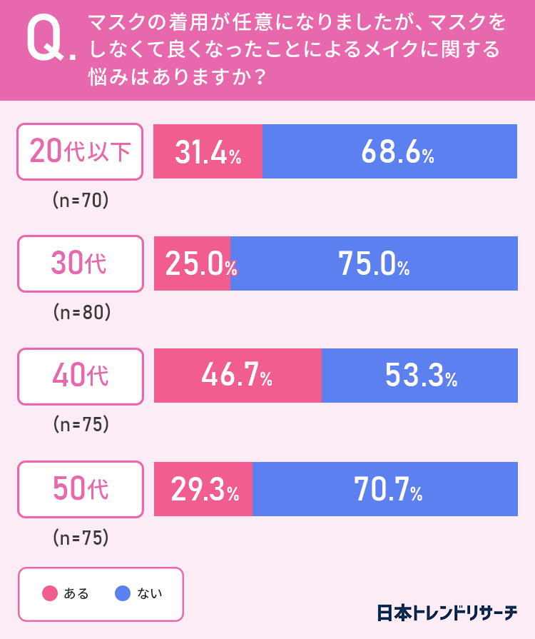 20代以下の31.4%が、マスクをしなくなったことによるメイクの悩みが「ある」と答えています。