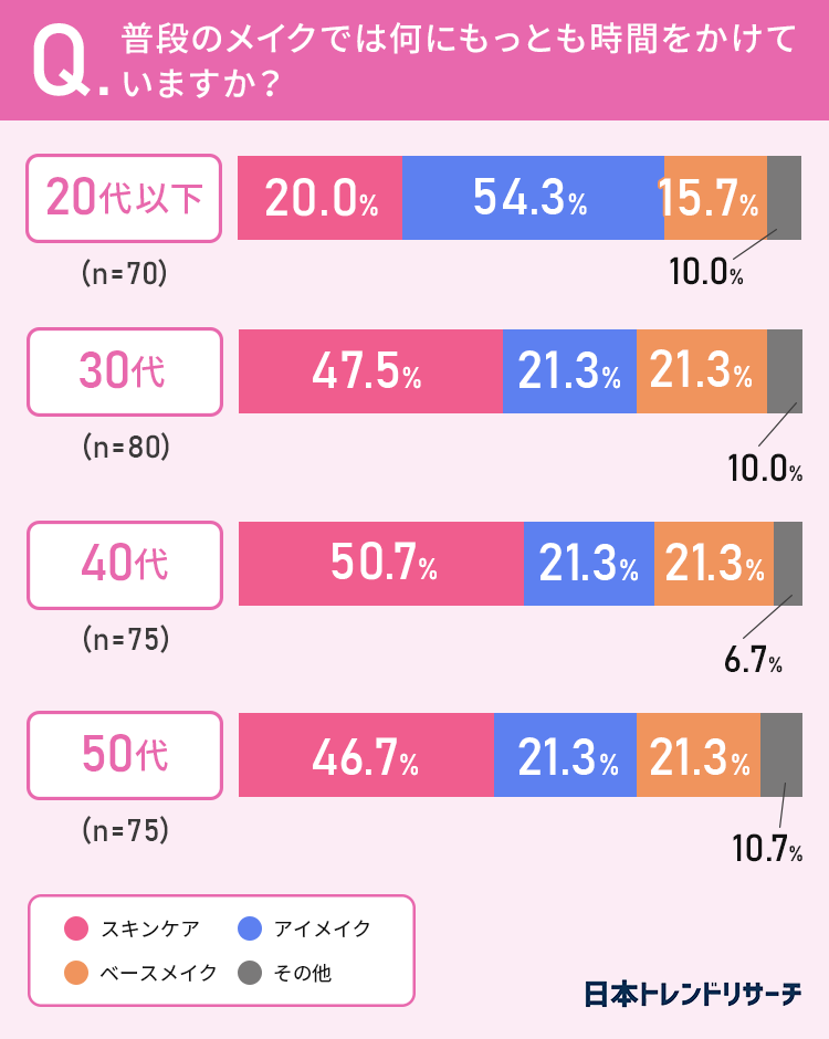 20代以下は「アイメイク」が54.3%と、半数以上の方がもっとも時間をかけていることが分かりました。