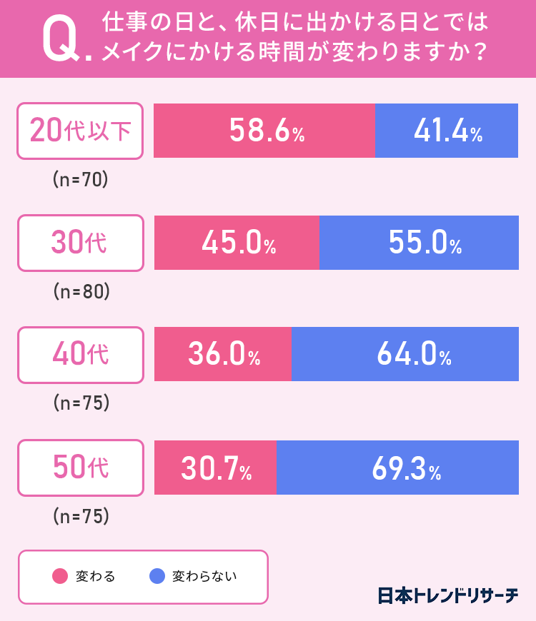 20代以下の58.6%の方が、仕事の日と休日に出かける日とでは、メイクにかける時間が「変わる」と回答しています。