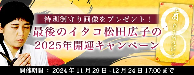 松田広子の公式占いサイト「恐山の秘術【最後のイタコ】松田広子」では、『2025年開運キャンペーン』を開催中です。2024年も残すところあとわずかとなりましたね。もうすぐ迎える2025年がどんな年になるのか気になっていらっしゃる方も多いと思います。この度当サイトでは、2025年の運勢を占う鑑定を多数ご用意いたしました。