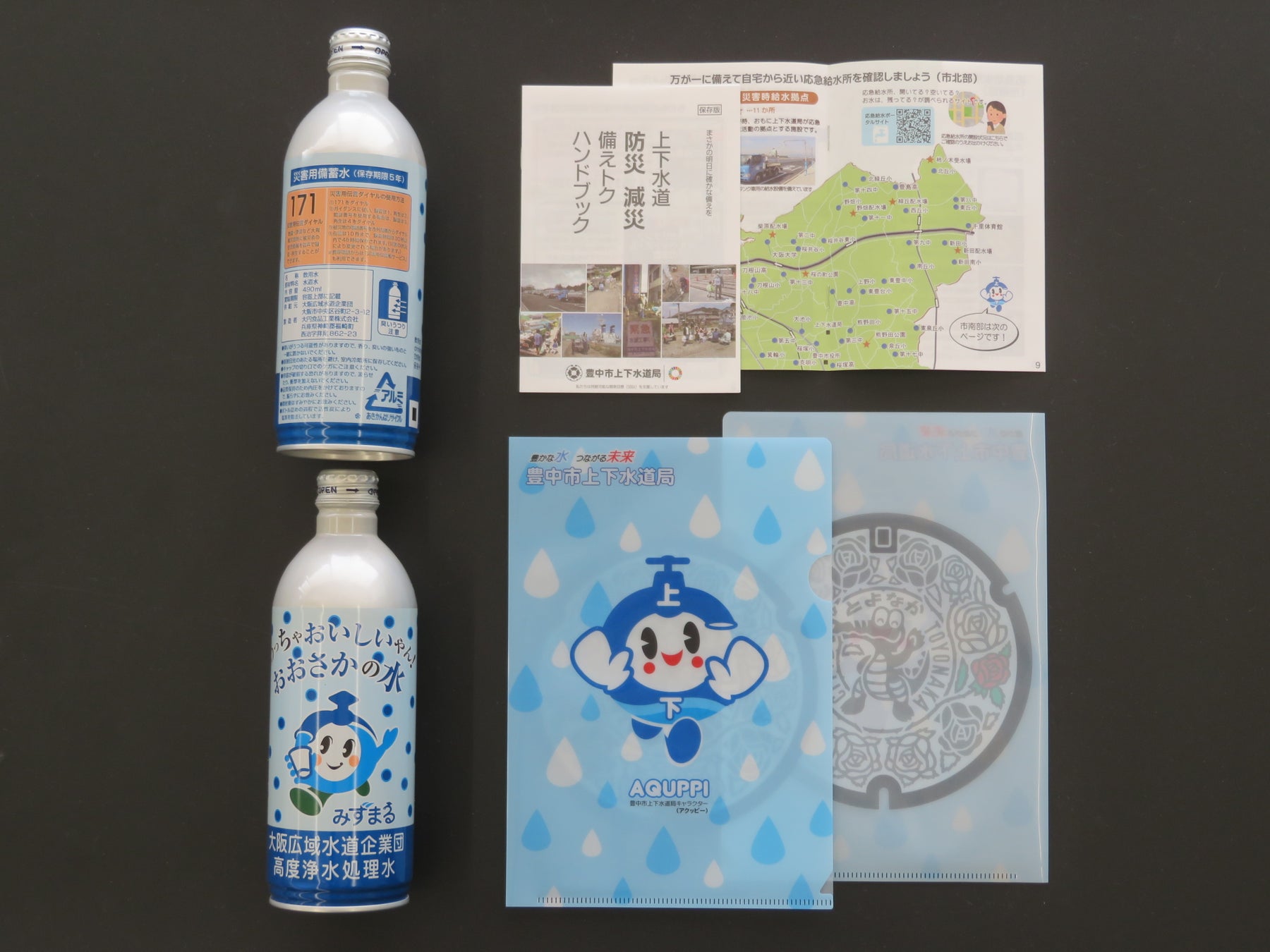配布物:アルミ缶入り備蓄水(高度浄水処理水)、「上下水道 防災減災 備えトクハンドブック」、クリアファイルなど合計1,320セット