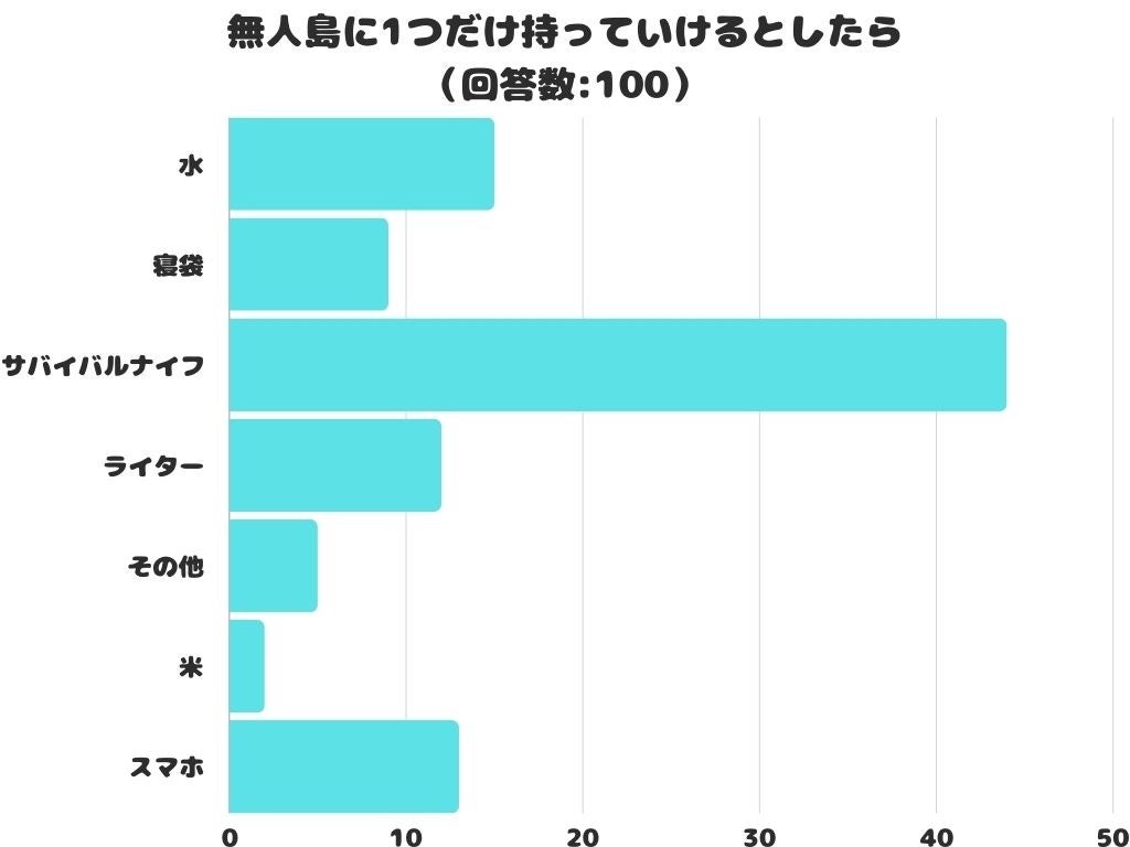 無人島に1つだけ持っていけるとしたら何を持って行くをアンケートにて調査したところ、1位は「サバイバルナイフ」でした。