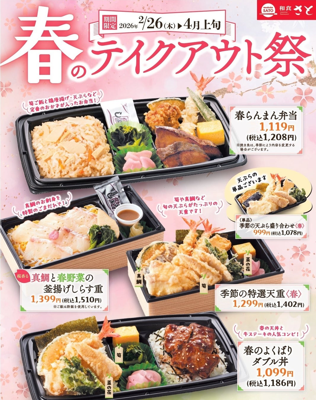 春の彩りと旬の美味しさを、ぜひこの機会に和食さとのテイクアウトメニューをお楽しみください。