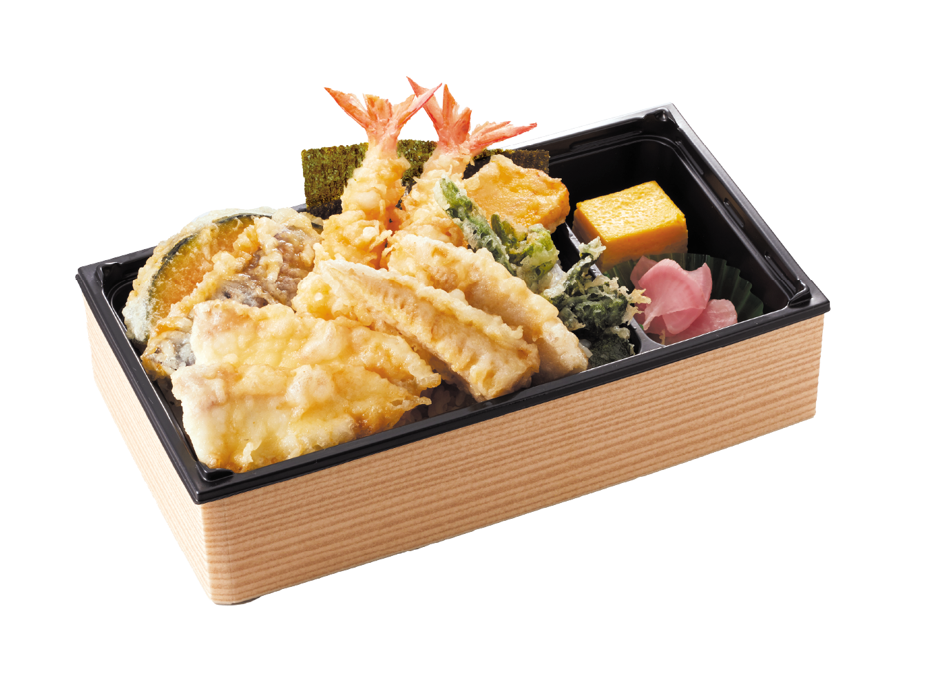 真鯛や筍、菜の花などの旬の食材を、軽やかな衣でサクッと揚げ、海老2本を添えた、食べ応えのある天重です。