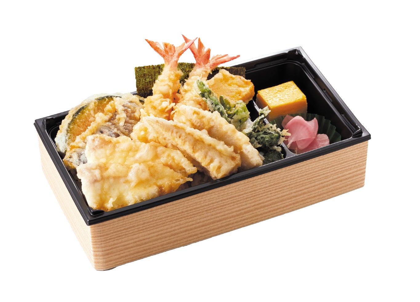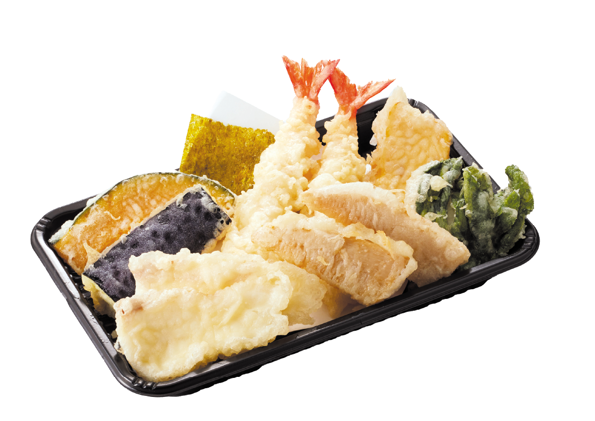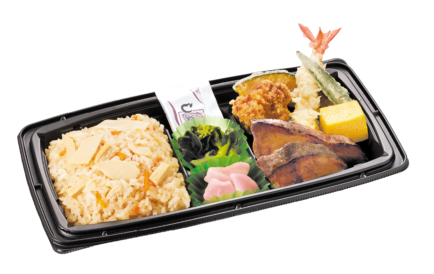 店仕込みの筍ごはんと菜の花が入り、鶏唐揚げと天ぷらなど定番のおかずと組み合わせ、彩り豊かに仕上げた季節限定弁当です。