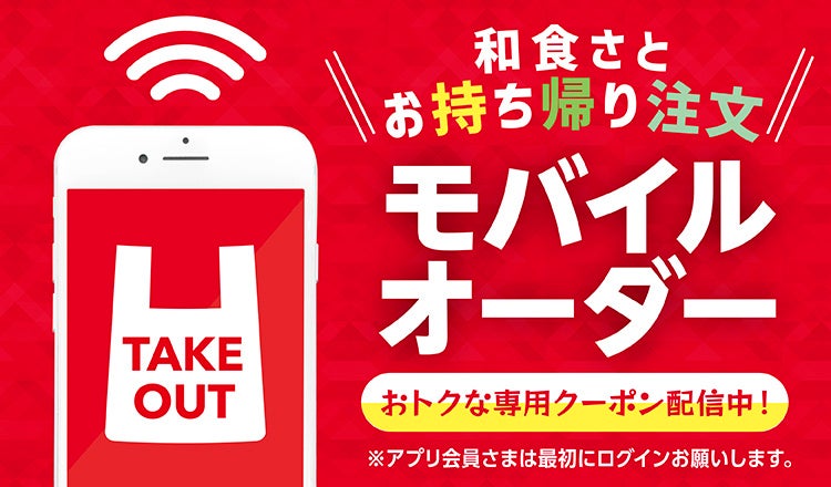 和食さとアプリでは、スマートフォンから事前にテイクアウトメニューを注文できる「モバイルオーダー」サービスをご利用頂けます。事前予約が可能なので、店舗で待たずに商品を受け取れたり、会計を事前に決済できたりととても便利な機能です。