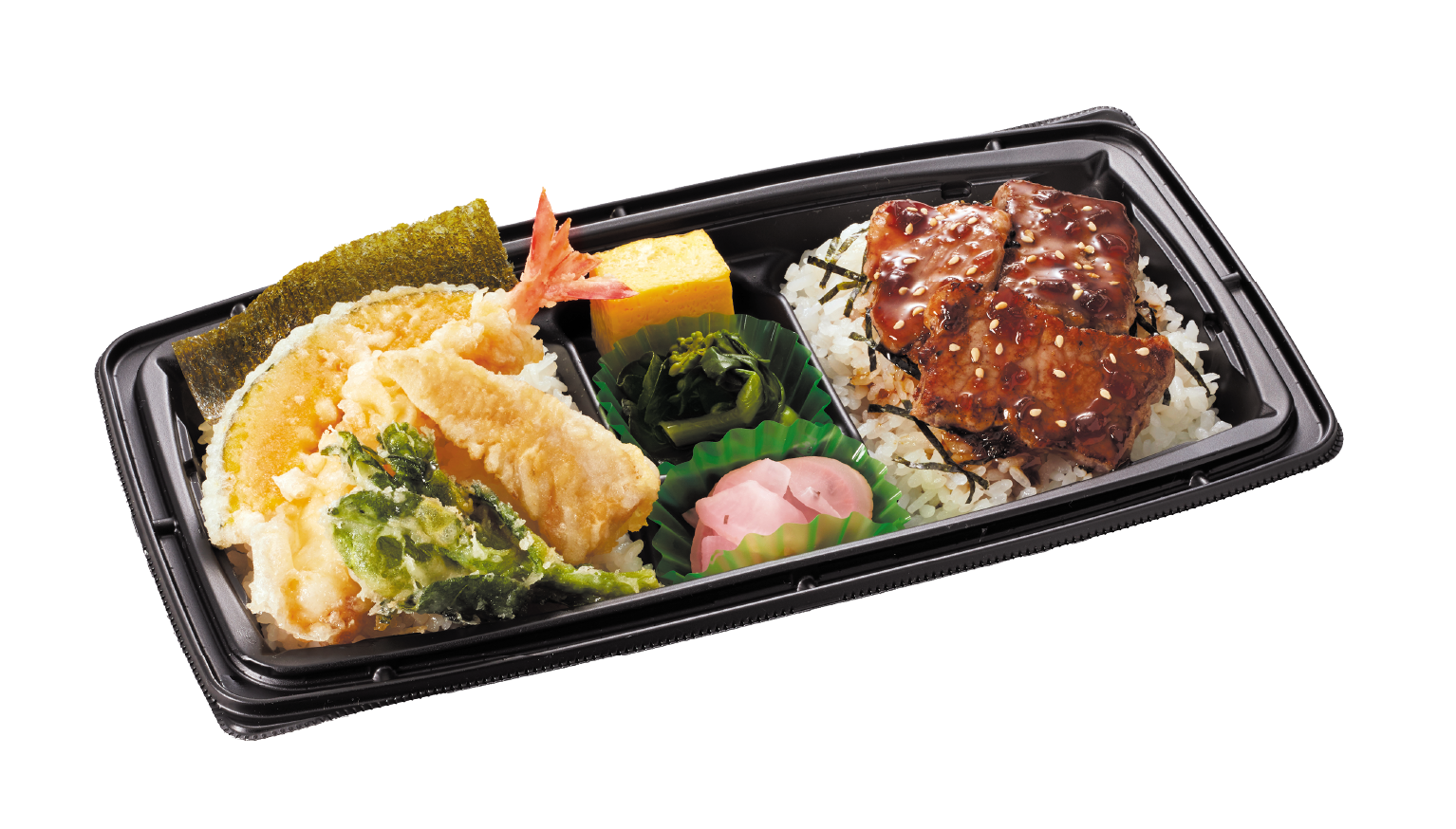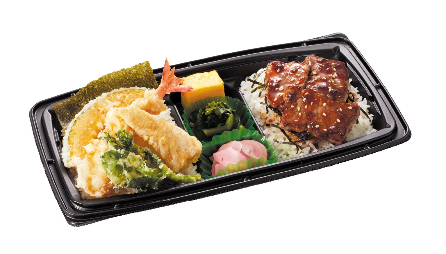 春の天丼と牛ステーキ丼を一度に味わえる、人気の具材を組み合わせた満足感たっぷりの丼です。