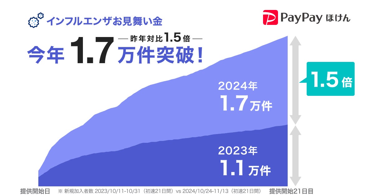 LINEヤフー株式会社(以下、LINEヤフー)のグループ会社である、PayPay保険サービス株式会社(以下、PayPay保険サービス)、Zフィナンシャル株式会社とPayPay株式会社(以下、PayPay)がキャッシュレス決済サービス「PayPay」内のミニアプリ(※1)「PayPayほけん」で提供している「インフルエンザお見舞い金」(以下、本保険)は、2024年10月24日の提供開始から21日間で加入件数1.7万件を突破しました。これは2023年の同時期と比較して1.5倍の増加となります。