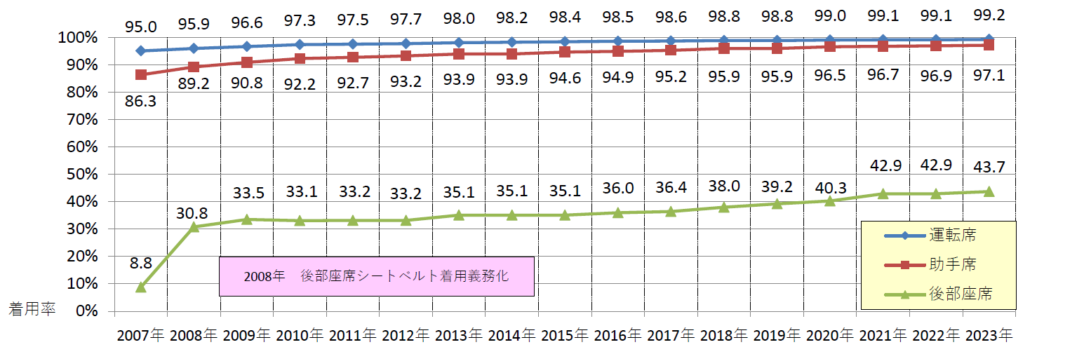 一般道路の後席シートベルト着用率は43.7%今なお低い、後席シートベルト着用の意識