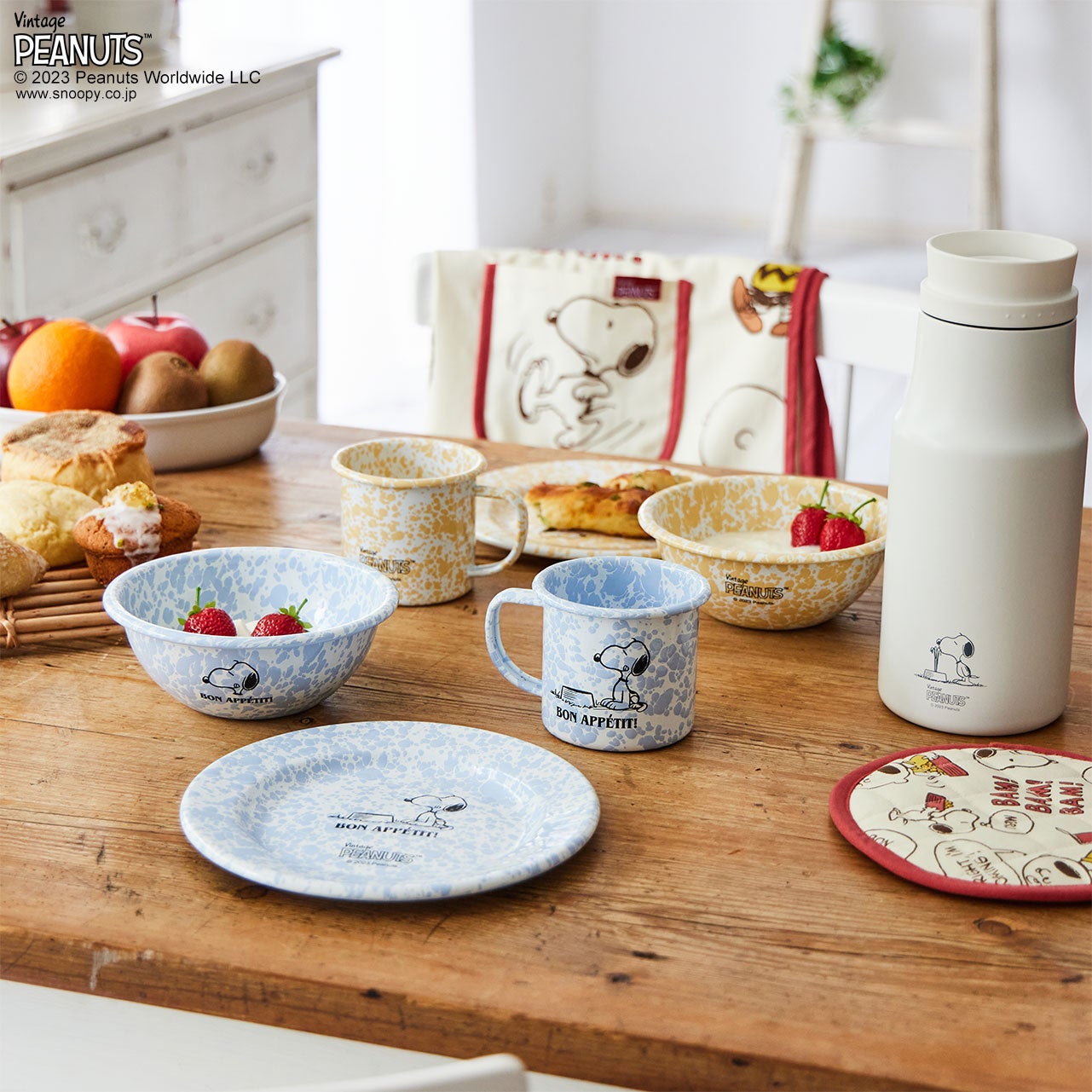 スプラッター柄が特徴的な「クロウキャニオンホーム」のホーロー食器がPLAZA限定でPEANUTS デザインに!360度どこからでも注げるポット、エプロン&ミトンも登場します。