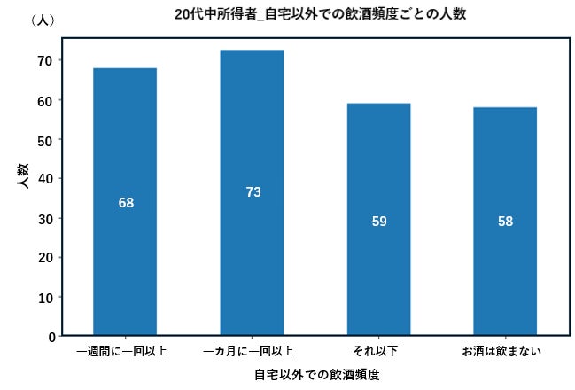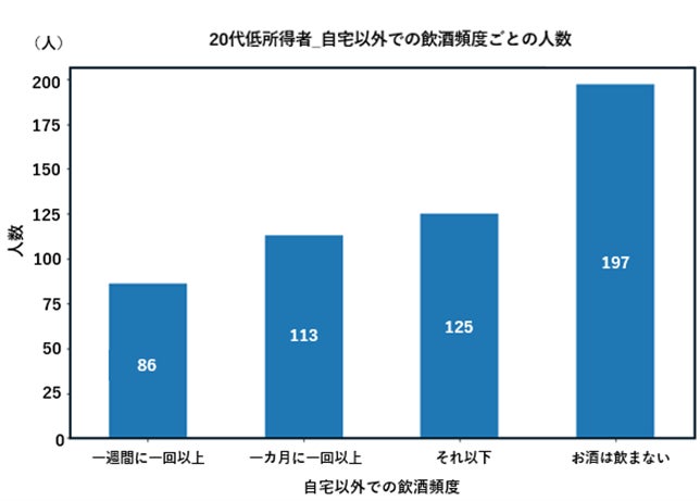・週1回以上、自宅以外での飲酒をする20代は、自宅以外で飲酒しない層に比べて充実感・自己成長・職場環境・協調性・外向性でスコアが有意に高い結果となりました。さらに、低所得層ではこれらに加えて自己満足のスコアが高くなりました。