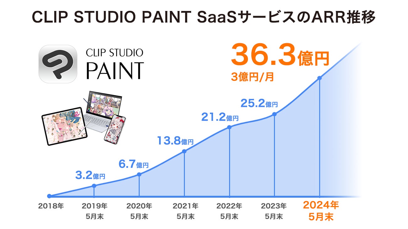 セルシスが開発・提供している、イラスト・マンガ・Webtoon・アニメーション制作SaaSサービス「CLIP STUDIO PAINT」のサブスクリプション契約売上が、2024年5月に1ヶ月で3億円を超え、過去最高となりました。ARRは36億円を超え(*1)、前年同月比のARR成長率は44%となっており、今後も売上の成長を見込んでおります。