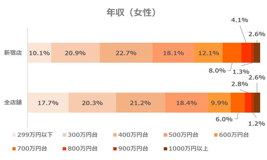 年収500万円台以上のすべての年収帯において、新宿店の割合が全店舗を上回っています。特に女性は年収600〜900万円台の割合が全店舗と比較して高いことから、都心で高い年収とキャリアを築いている女性が結婚相談所での効率的かつ質の高い出会いを求めていることがわかります。