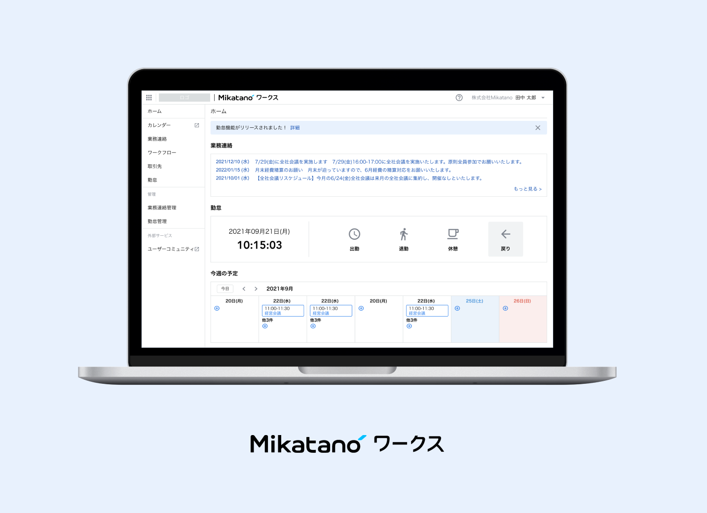 『Mikatano ワークス』は、金融機関を通じて、金融機関の法人顧客に当社が提供する、DXを支援するためのサービスです。コミュニケーションツール、ワークフロー、勤怠管理などのグループウェアをはじめとした日常業務に活用できるデジタルサービスが、簡単かつ直感的なUI/UXで搭載されています。IT担当者の不在などでDXが進んでいない企業でも簡単に安価で利用することができ、業務のデジタル化の第一歩を進めていくことができるサービスです。