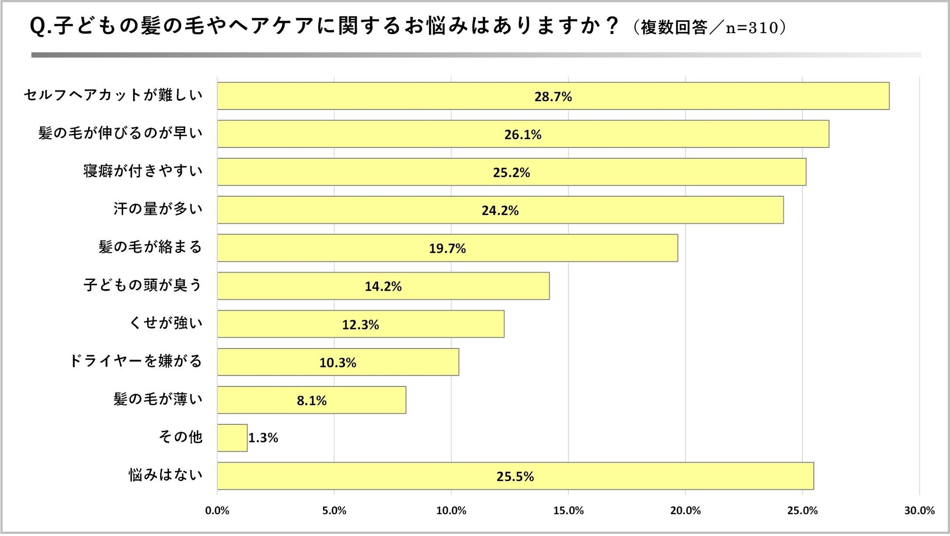 一方、「悩みはない」と回答した方は25.5%に留まっており、全体の約75%の母親は子どもの髪の毛に関して何らかの悩みを感じていることが分かりました。