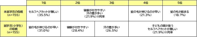 また、この質問を子どもの年齢別に見たところ、小学校入学前の未就学児の母親は、全体の結果と同様に「セルフヘアカットが難しい」(35.5%)がトップとなりました。2位は同率で「寝癖が付きやすい」「汗の量が多い」(21.9%)となっています。