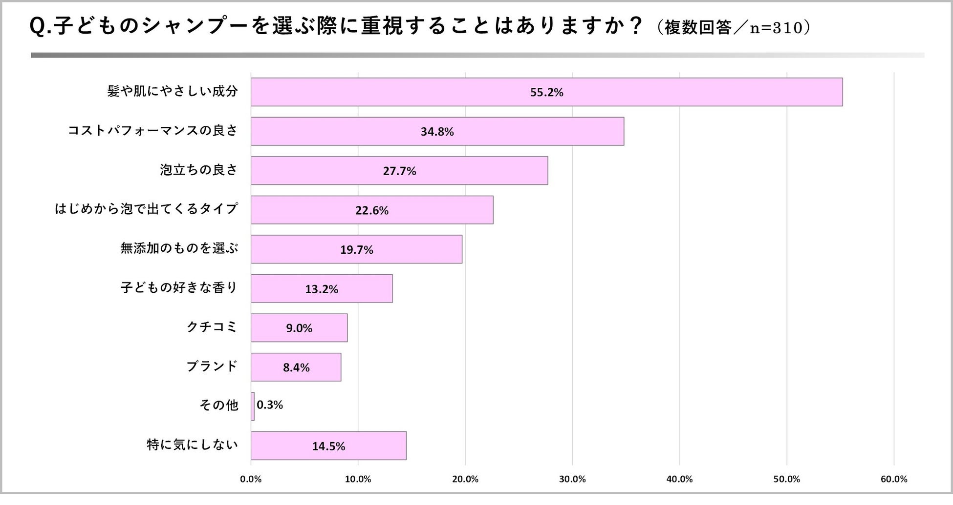 子どものシャンプーを選ぶ際に重視することを尋ねたところ、半数以上の方が「髪や肌にやさしい成分」(55.2%)と回答しました。次いで「コストパフォーマンスの良さ」が34.8%で2位となり、家計の面からシャンプー選びをする方が多いことも分かります。