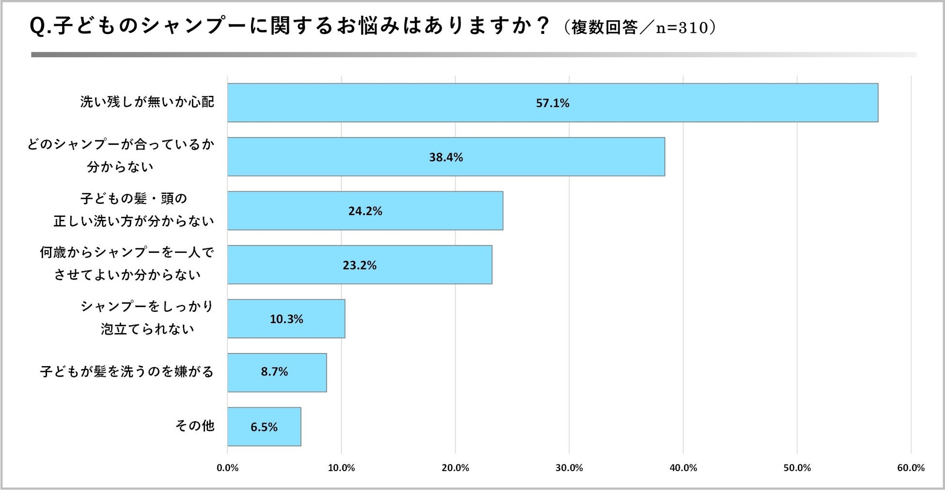 続いて、子どものシャンプーに関するお悩みを尋ねたところ、半数以上の母親が「洗い残しが無いか心配」(57.1%)と回答する結果となり、子どもがしっかり髪を洗えているのか、心配する方が多い様子がうかがえます。次いで、「どのシャンプーが合っているか分からない」が38.4%で2位となっており、子どものシャンプー選びに悩まれる方も多いことが分かります。
