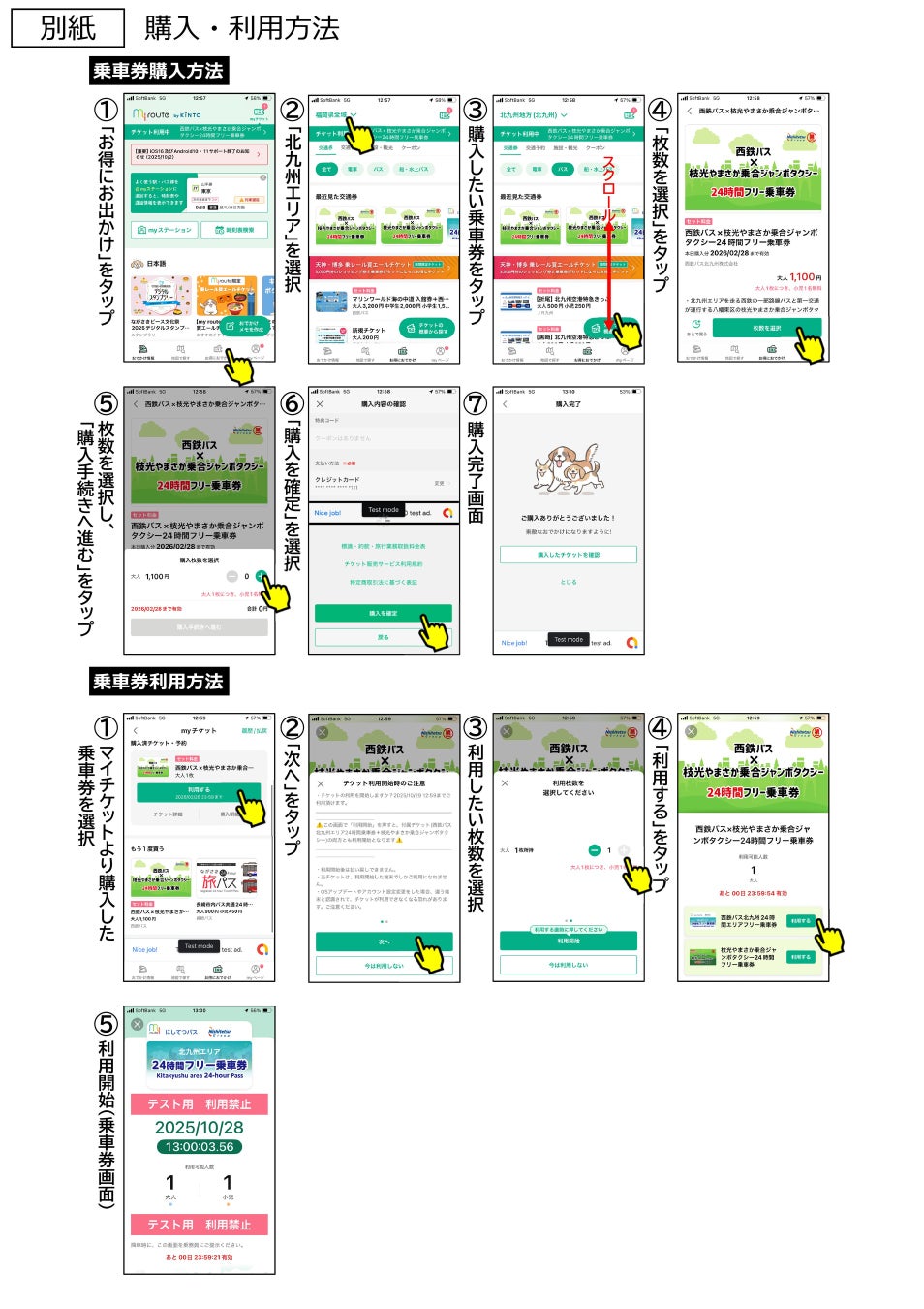 本乗車券は、北九州市内を運行する西鉄バス及び㈱第一交通が運行する枝光やまさか乗合ジャンボタクシーが、24時間乗り放題となる乗車券で、スマートフォン向けおでかけアプリ「my route」での限定販売となります。枝光地区のおでかけ交通(※)から、他モードの活用による公共交通の利用促進を目的とした乗車券で、西鉄バスと第一交通が連携した商品の販売は、本乗車券が初となります。