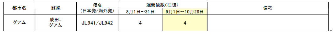 2. 7月中旬から8月まで週4便の運航計画をご案内している成田=グアム線について、9月以降も週4便の運航を継続します。