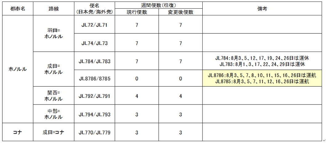 ・JL8785(ホノルル発):8月3日、5日、7日、12日、26日