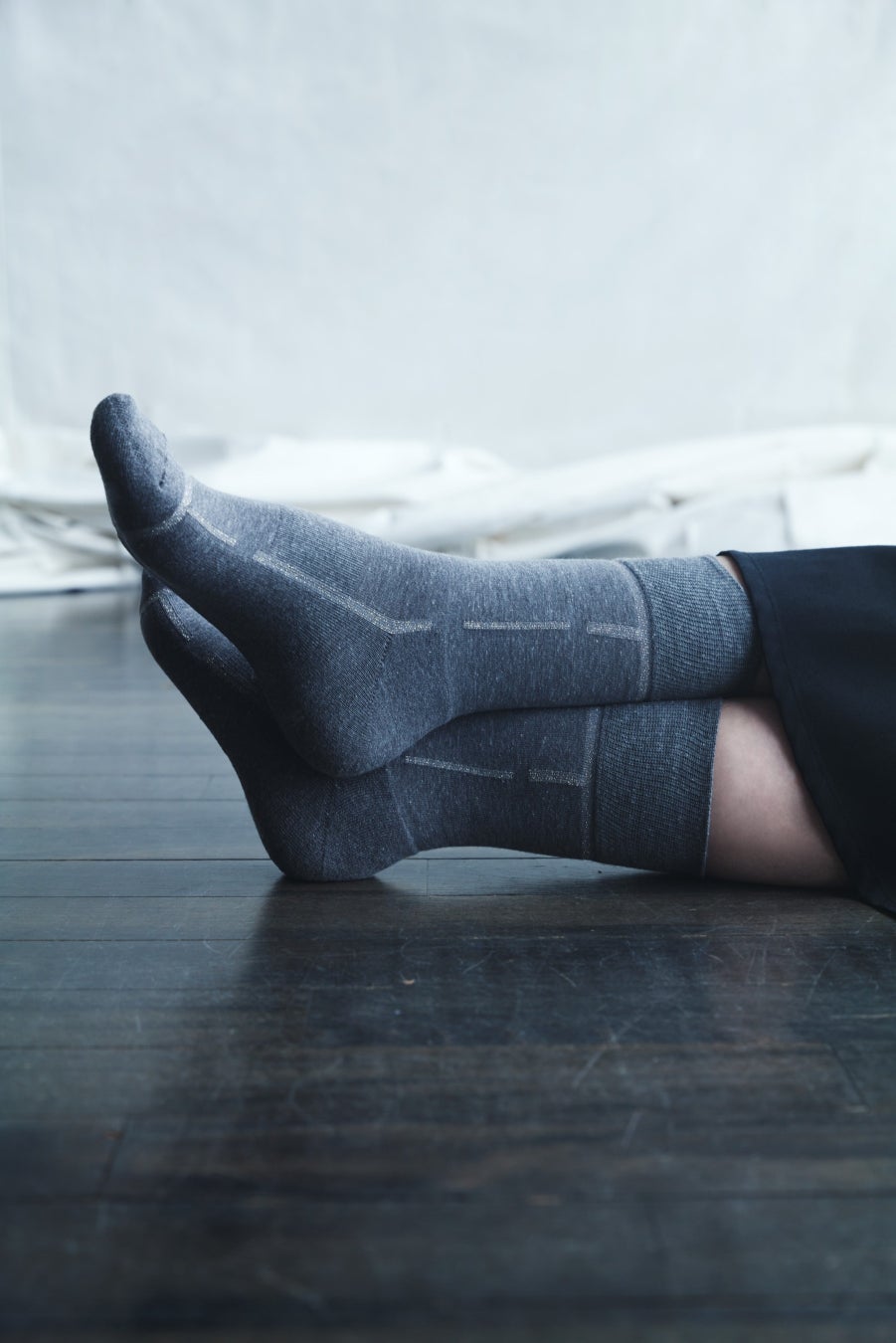 Y’s、CHICSTOCKSとのコラボレーションソックス第3弾を展開。CHICSTOCKSの定番の「ライン」が印象的なモデルをベースに、Y’sの視点でアレンジしたライン着圧ソックスや、ラメ糸を使用した薄手のハイゲージソックスに加え、「Y」と「S」が後ろに配された起毛ソックスをラインナップ。