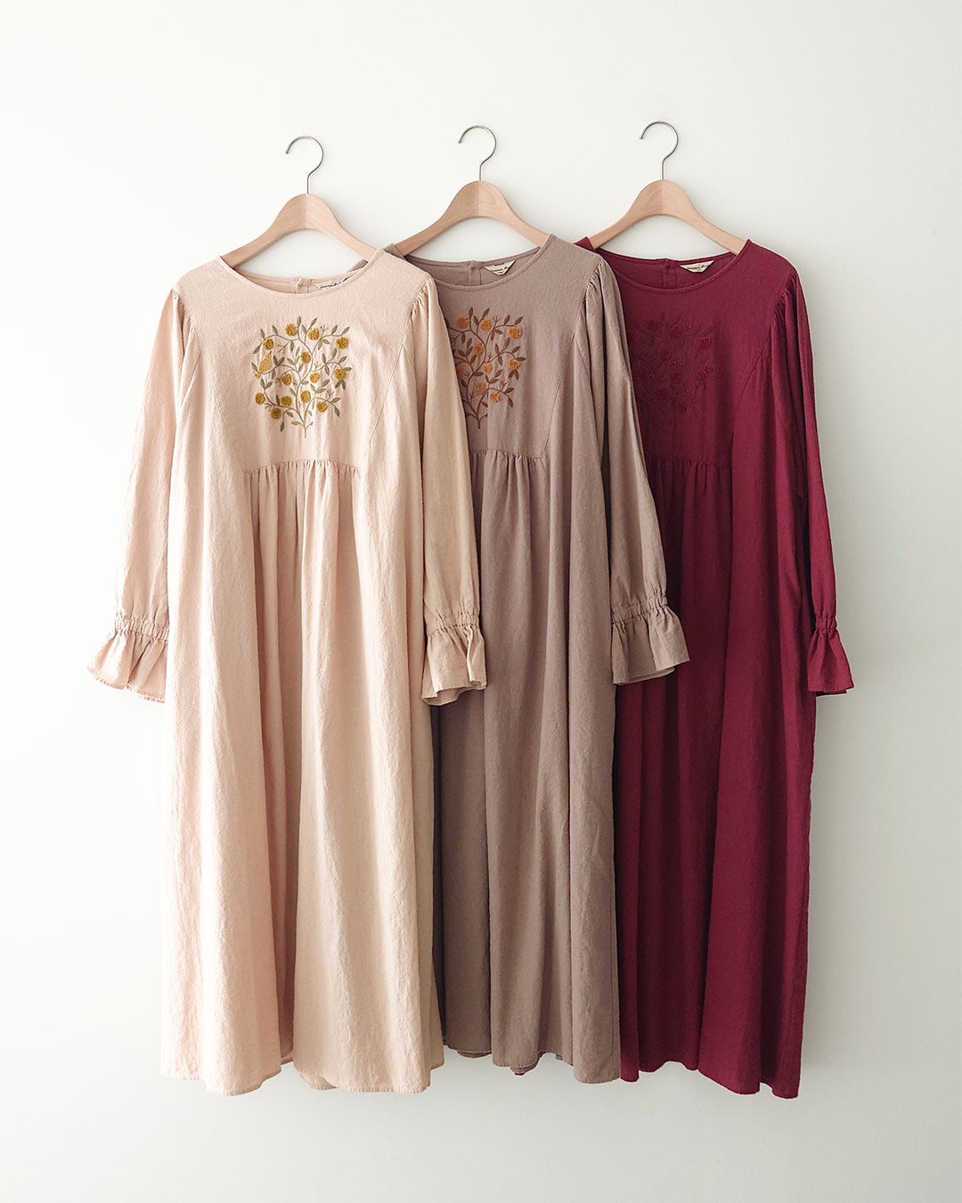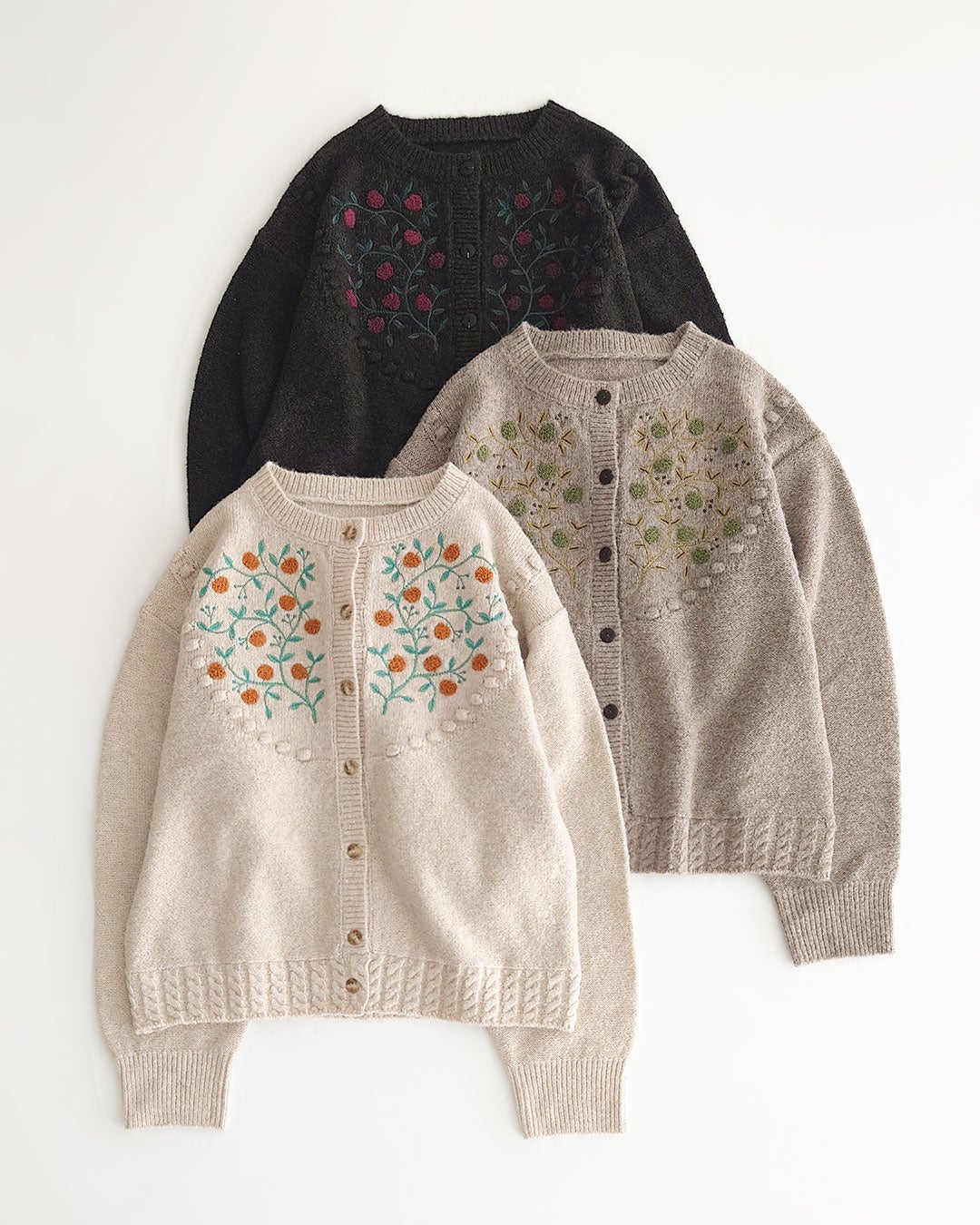 ワンピースとニットは、ふっくらとした果実に思わず小鳥たちも寄ってくるような、森の奥で静かに実りの時を迎えるリンゴの木を図案とした刺繍がポイント。ほっこりとした秋らしいデザインに仕上げました。