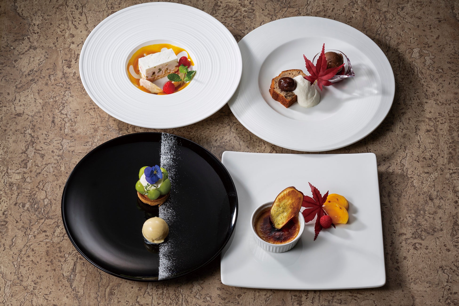 キメが細かく霜降りでジューシー、なめらかな舌触りが特徴と言われる東京の銘柄豚「TOKYO X」と佐賀牛、仔羊の3種を盛り合わせたメイン料理のほか、松茸や日本各地の秋の味覚を取り入れたメニューです。デザートはシャインマスカットのスイーツなど4種からお選びいただけます。