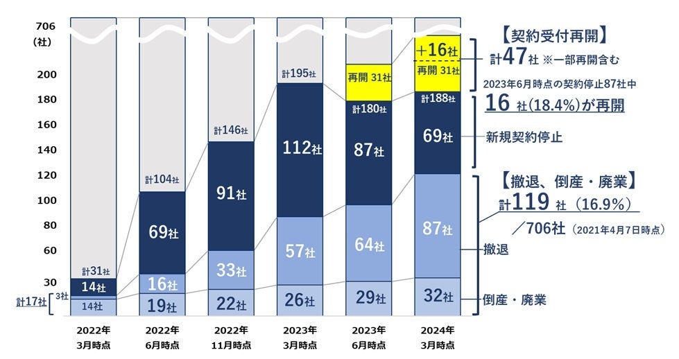 「新規契約停止」は累計69社(構成比9.8%、前年同月比38.4%減)となり、市場価格の落ち着きなどから「契約受付再開」は累計47社(同6.7%、2023年6月比51.6%増)へと増えた。前回調査で「新規契約停止」となった87社のうち、今回は16社(同18.4%)がサービスを再開(一部再開を含む)した。