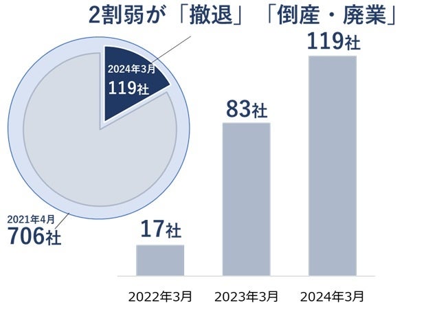 2021年4月7日時点で登録のあった「新電力会社」(登録小売電気事業者)706社のうち、2024年3月22日時点で「撤退」「倒産・廃業」が判明したのは累計119社(構成比16.9%)。1年前(2023年3月時点)の83社(同11.8%)から36社(43.4%)増加し、2年前(2022年3月時点17社)の7倍に急増した。