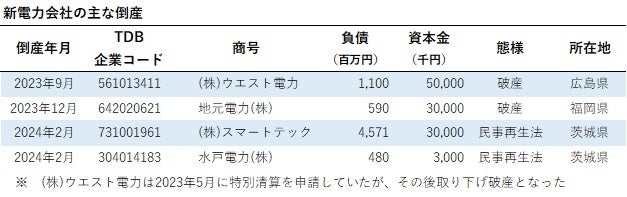 「倒産」は、地元電力(株)(福岡県、2023年12月破産、負債5億9000万円)、(株)スマートテック(茨城県、2024年2月民事再生、負債45億7100万円)とグループ会社の水戸電力(株)(茨城県、2024年2月民事再生、負債4億8000万円)の3社が今回調査で判明した。3社とも、電力販売事業に際しての電力の調達は卸市場や他企業など外部からの仕入れが中心で、市場での調達価格と需要家への販売価格が逆ザヤとなり収益を圧迫した。