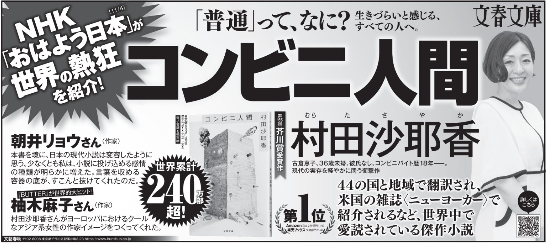 株式会社文藝春秋(本社:東京都千代田区、社長:飯窪成幸)が発行する、村田沙耶香さん『コンビニ人間』(文春文庫)が、世界累計250万部を突破しました。44の国と地域で翻訳が決定しており、日本国内では195万部超、イギリスでも40万部超の大ベストセラーになっています。(2025年12月時点)