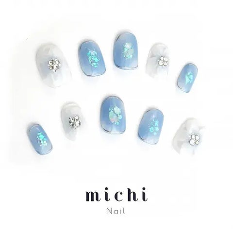 明るすぎないニュアンスブルーと、クリアベースのフラワーアートを組み合わせた可憐なデザイン。ポイントにオーロラのダズリングパウダーを施し、透明感の中にさりげない輝きをプラスしています。