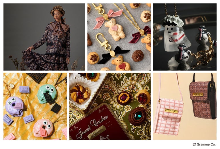 身に着けている人も、それを見る人も、 楽しくなるようなポジティブアクセサリーをテーマに ハロウィンらしいゴシックなものから、本物以上にリアルな質感のスイーツモチーフまで様々なアクセサリーやバッグがラインナップ。