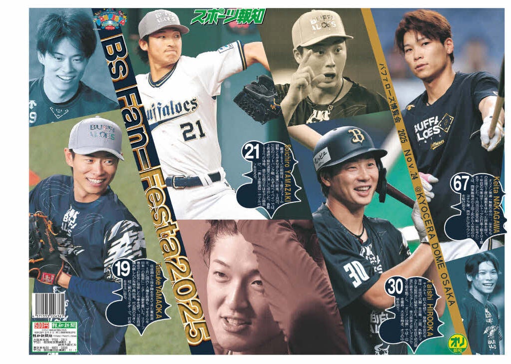 スポーツ報知を発行する報知新聞社(代表取締役社長・長谷川剛)はプロ野球・オリックスのタブロイド新聞「ファンフェスタ特別号」(税込み500円、オールカラー20ページ)を、ファンフェスタ(京セラドーム大阪)が開催される11月24日から発売します。岸田護監督と来季から兼任コーチとなる平野佳寿投手のインタビューや、来年3月のWBC出場を目指す選手たちの紹介、岸田監督が選んだ今季の名場面など盛りだくさんの企画です。今回は1面&最終面が「コミック」「ビジュアル」バージョンの2種類(記事内容は同じ)を用意しました。 球団直営店「Bs SHOP」(京セラD内)「B―WAVE」(神戸・三宮)、東京・池袋の「報知エンターテインメントマーケット」(P'PARCO3階)などのほか、25日午後5時から大阪本社販売局ネットショップ(https://hochi-osakahanbai.com/)でも購入可能です。