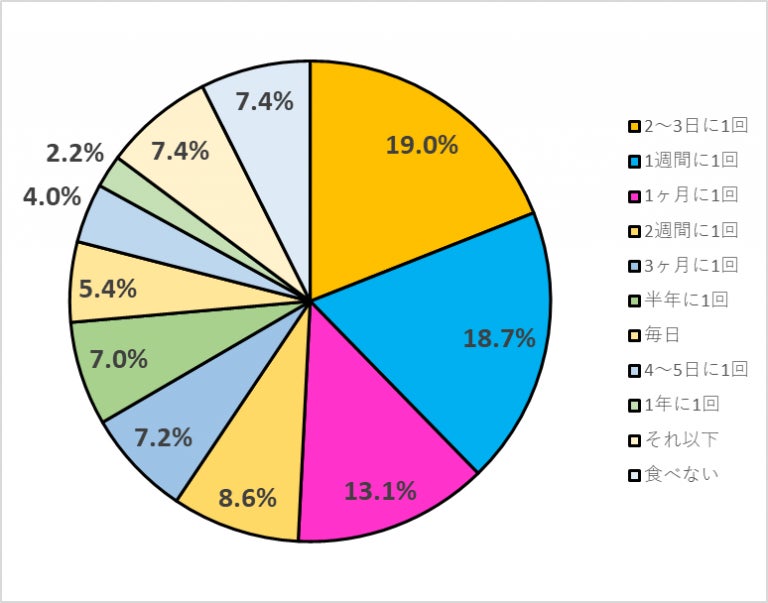 ふりかけを食べる頻度で最も多かったのは、「2~3日に1回」の19.0%でした。次に多かったのが、「1週間に1回」18.7%、「1ヶ月に1回」13.1%となりました。