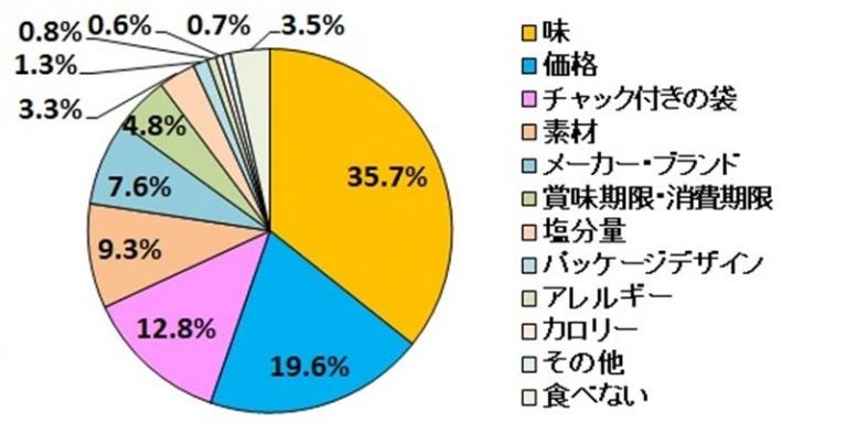 ふりかけを購入する時に重視することを複数回答可で質問したところ、「味」がトップで回答数の35.7%と3分の1を超えました。「価格」(19.6%)と合わせて上位2つで半数を上回っています。