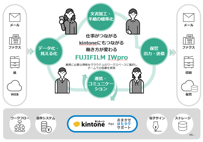 NTT東日本は富士フイルムビジネスイノベーションジャパンと協業し、「kintone for おまかせ はたラクサポート」を活用してさらなるデジタル化・効率化を推進していきます。富士フイルムビジネスイノベーションが提供するFUJIFILM IWpro※4「kintone for おまかせ はたラクサポート」を連携することで、複合機からスキャンした紙文書や、FAX受信文書など、さまざまな手段で届く文書を一元的に取込み、文書に記載されたデータを自動で「kintone for おまかせ はたラクサポート」へ登録することができます。これにより、「kintone for おまかせ はたラクサポート」への手入力工数を削減し、文書やデータのやり取りを飛躍的に効率化することができます。また、登録した文書やデータは「kintone for おまかせ はたラクサポート」へ自動連携・保存ができたり、FUJIFILM IWproの文書管理機能に保管して、「kintone for おまかせ はたラクサポート」側から検索取得することも可能です。