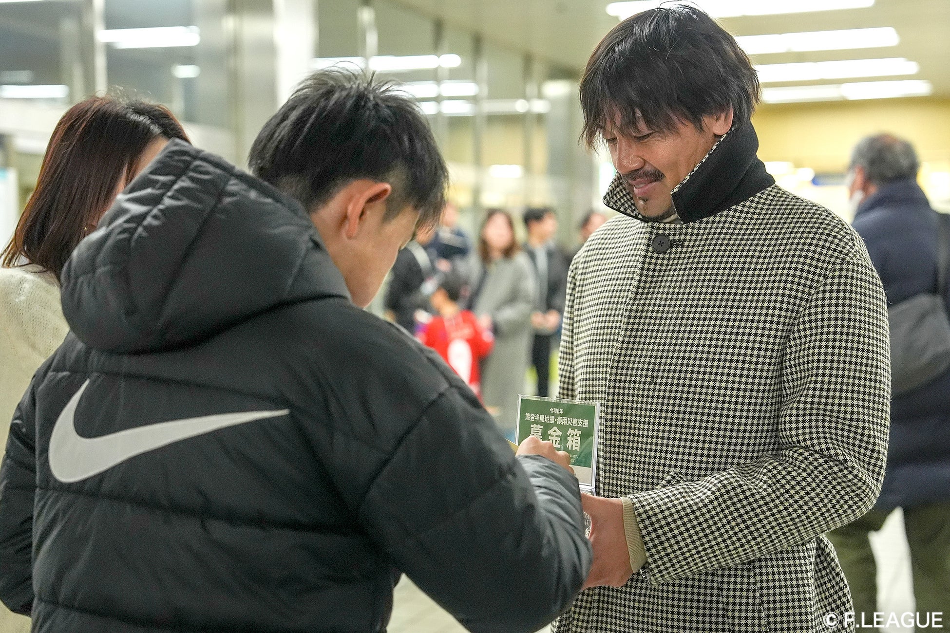 ヴィンセドール白山・アビームコンサルティングと3社共同で実施している復興支援プロジェクトの一環として、入退場口前のブースエリアにて募金活動を実施しました。日本フットサルトップリーグ 松井大輔 理事長が募金箱を持って募金を呼びかけたほか、ボルクバレット北九州の選手や、石川県出身のしながわシティ・田村龍太郎選手たちも支援を募りました。