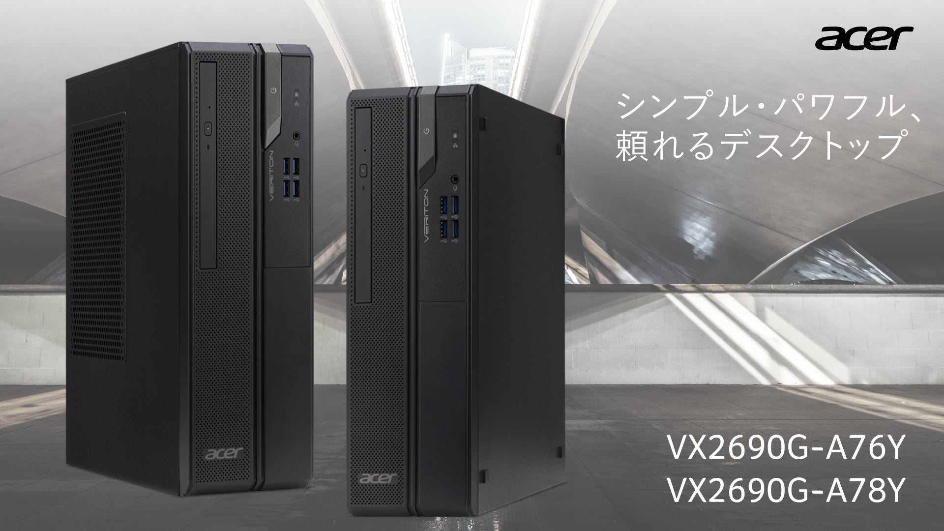 Acer Veriton 2000 Compact Towerシリーズの新製品「VX2690G-A76Y」「VX2690G-A78Y」は、動画編集など負荷のかかる作業もスムーズに行える第12世代インテル(R) Core(TM) i7プロセッサーを搭載。OSは、Windows 11 Proのダウングレード権を利用した Windows 10 Proモデルです。搭載アプリのAcer ControlCenterからWindows 11 Proへの変更も可能です。ストレージは大容量の512GB SSDを搭載。メモリーは、「VX2690G-A76Y」は16GB、「VX2690G-A78Y」は8GBを搭載しています。さらに、 用途に合わせてMicrosoft Office Home & Business 2021、またはMicrosoft Office Personal 2021のプリインストールモデルからお選びいただけます。製品本体のほかに、USBキーボードやUSB光学マウス、マウスパッドも同梱しているため、外部モニターにつないですぐに使用することができます。