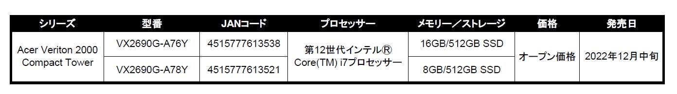 日本エイサー株式会社(本社:東京都新宿区、代表取締役社長:ボブ・セン)は、ビジネスデスクトップパソコンのVeriton(ベリトン)シリーズより、幅わずか約10cmのコンパクト設計の新モデル2機種「VX2690G-A76Y」「VX2690G-A78Y」を、法人市場に向けて2022年12月中旬より販売します。今回発売する新モデルはビジネス用途に合わせてお選びいただける、メモリー16GBと8GB搭載の2タイプ。置き場所を選ばないシンプルなデザインで、オフィスや店舗事務所での使用にオススメの新モデルです。なお、本製品群はAcer公式オンラインストアでも販売します。