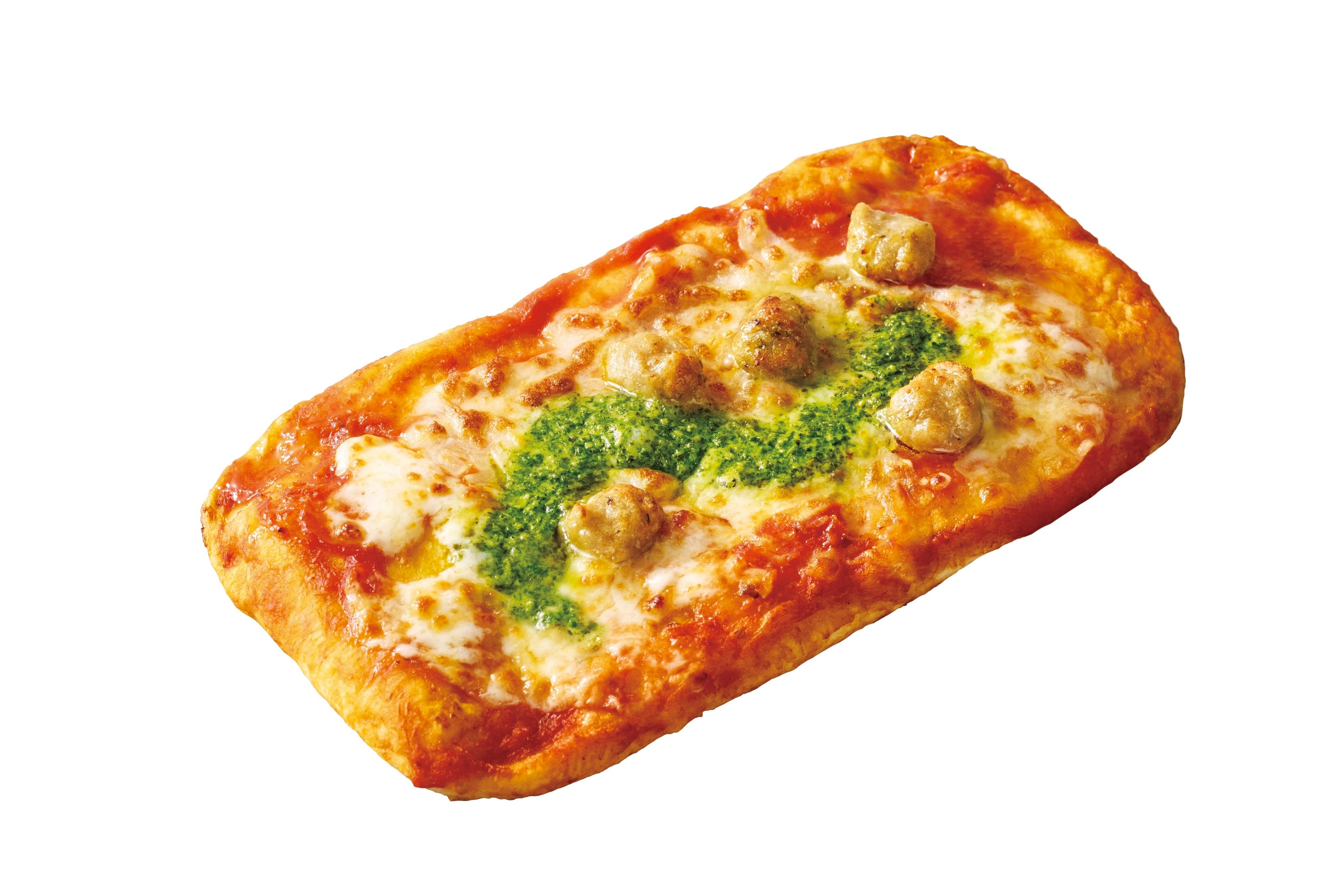 もち粉を加えたもちもちのピザ生地に、ハーブミートボール・モッツァレラチーズ・ジェノベーゼソース・トマトソースをトッピングしました。ハーブの効いたミートボールが味のアクセントになった商品です。