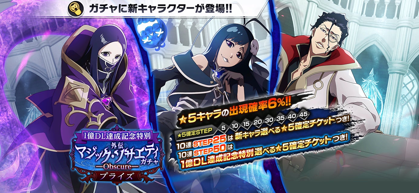 ブレソル公式X(@Bleach_BS)をフォローして「1億DL達成記念特別 外伝マジック・ソサエティプライズガチャ―Obscure―」PVのポストにリアクションしてくれた方に、強化アイテムや★5確定アクセサリガチャチケットなどのゲーム内アイテムをプレゼント!