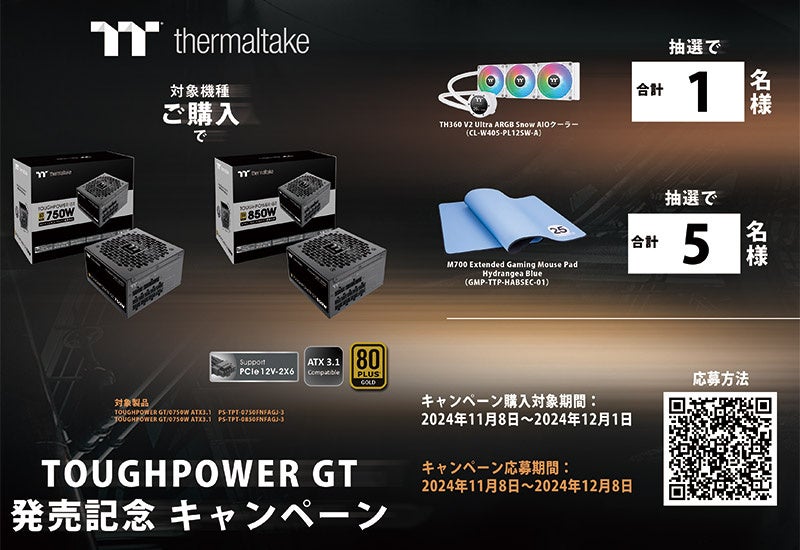 株式会社アスク(本社:東京都千代田区)は、2024年11月8日(金)~12月1日(日)までの期間、Thermaltake社製電源ユニット「TOUGHPOWER GT」シリーズをご購入いただいた方を対象に、抽選で同社製水冷一体型CPUクーラーやゲーミングマウスパッドが当たるキャンペーンを実施いたします。