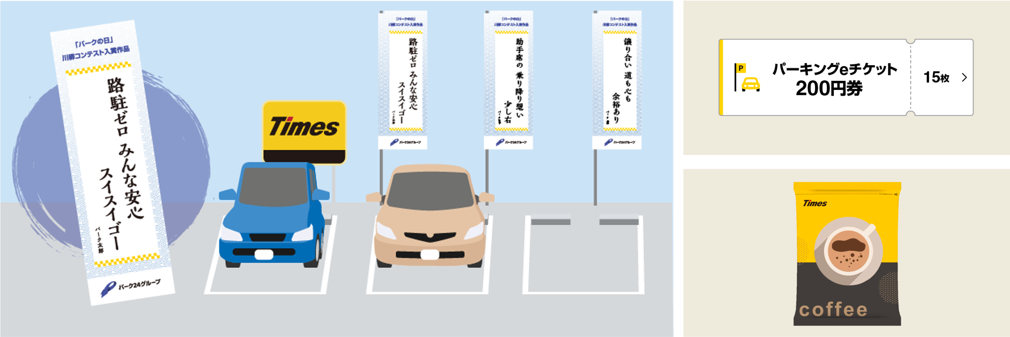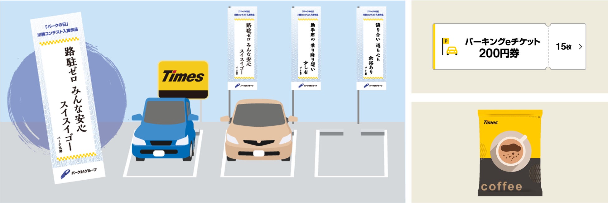 ・入賞作品を印字したのぼり旗を作成し、日本国内のタイムズパーキングに掲出 ※タイムズクラブアプリ精算専用の電子優待券。受け取り・ご利用の際はドライバー向け会員制サービス「タイムズクラブ」へのご入会とタイムズクラブアプリのダウンロードが必要になります |