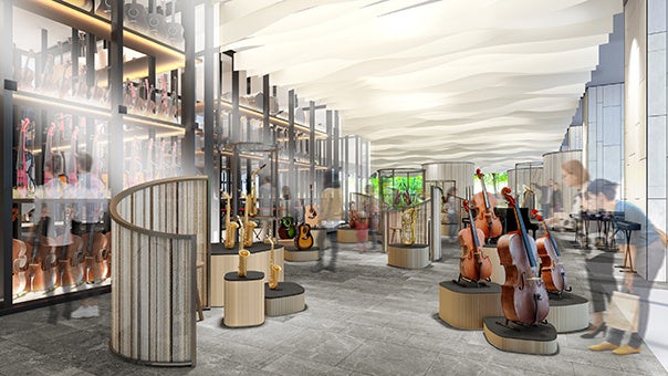 1階には大型ビジョンを設置したブランドの体験エリアと、ヤマハとベーゼンドルファーのピアノショールーム、2階は誰でも気軽に楽器に触れて試すことができる体験型の楽器売場と横浜エリア最大級の品揃えとなる楽譜・書籍売場、3階では大人向けの音楽教室を展開します。2階にはライブができるイベントスペースを備えたカフェを開設し、音楽や楽器との心地よい時間と空間を提供します。