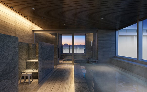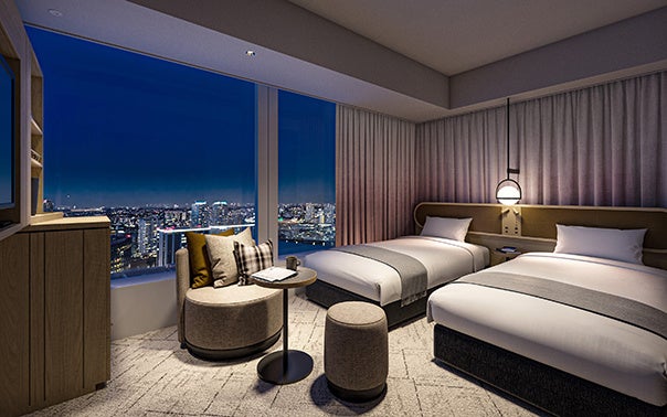 本ホテルロビーは、26 階(地上約 130m)に位置し、空に浮かぶ寛ぎの空間を演出します。全150 室の客室は27 階以上の高層階にあり、すべての客室からみなとみらいの開放的な景色を望むことができます。客室は、「ダブル」「ツイン」「ユニバーサル」に加え、最大4名まで利用可能な2段ベッドのある「フォース」を導入し、ゲストのさまざまな利用用途に対応できる構成となっています。また、「京急 EXホテル」ブランドでは初の大浴場・露天風呂を設け、天気の良い日は富士山を見ながら入浴することができます。ビジネスだけでなくレジャー利用にも対応できる「京急 EXホテル」として、多様化する宿泊ニーズに応えていきます。