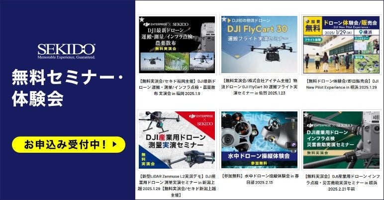 セキドでは、より多くの事業者の方にドローンを使った業務効率の改善を実現していただくため、業務用ドローンや関連ソリューションをご紹介する無料セミナーやイベントを定期的に開催しております。今後もオンラインや全国各地での開催を予定しておりますので、ご興味をお持ちのイベントにはぜひお気軽にご参加ください。