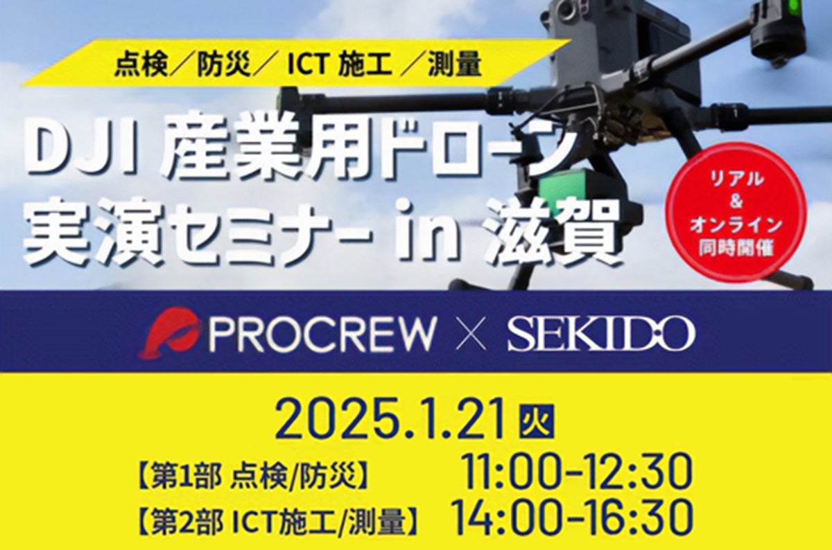 DJI(ディージェイアイ)正規販売代理店としてドローンビジネスの最先端を支える株式会社セキド(本社:東京都港区、代表取締役:⼤下貴之)では、株式会社プロクルー(本社:滋賀県長浜市、代表取締役:酒井正裕)と共同で1月21日(火)に、高所点検や防災、ICT施工、測量といった業務でのドローン活用についてデモ飛行や取得データを交えてご紹介する「DJI産業用ドローン実演セミナー」を滋賀県米原市で開催、オンラインでも同時配信いたします。