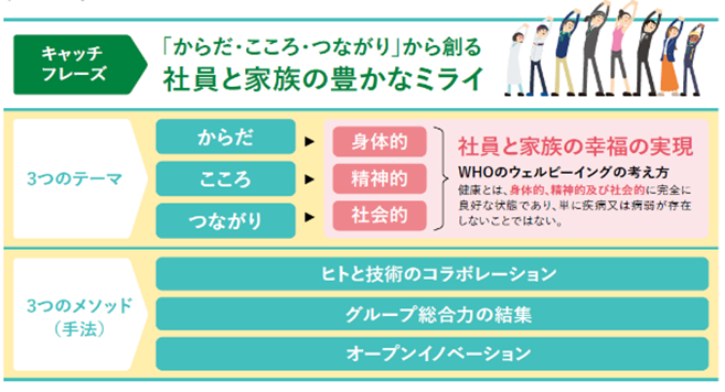 ※WHO(世界保健機関)のウェルビーイングの考え方を参考に、「からだ」「こころ」に「つながり」を加えました。グループ各社、職場、社員が「つながる」ことで健康を高めていきます。